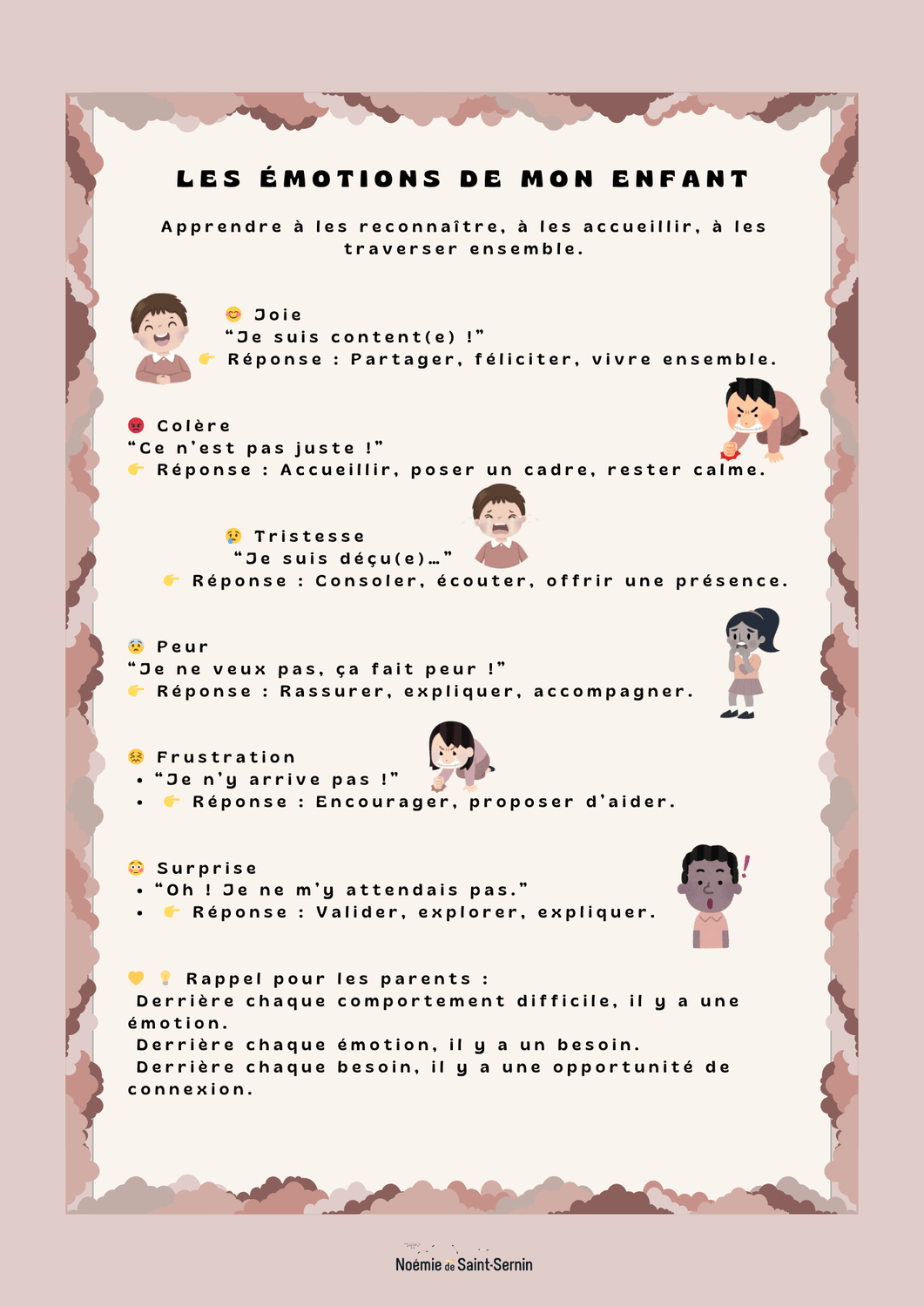 Une affiche colorée, simple et pédagogique, à accrocher chez vous pour aider votre enfant (et vous-même) à mieux comprendre et traverser ses émotions.